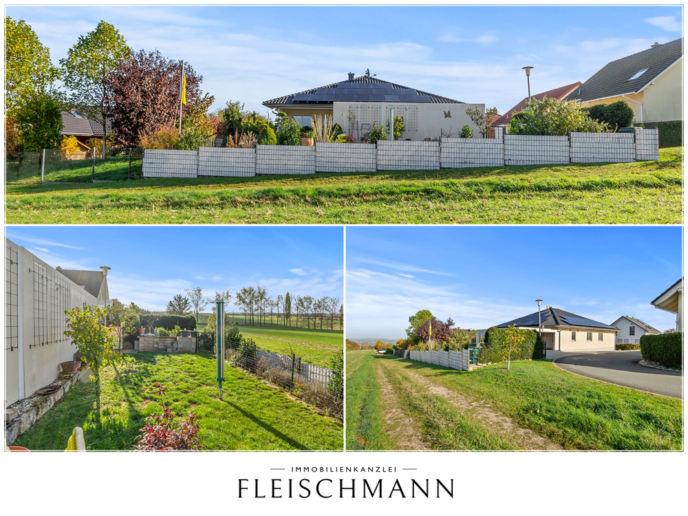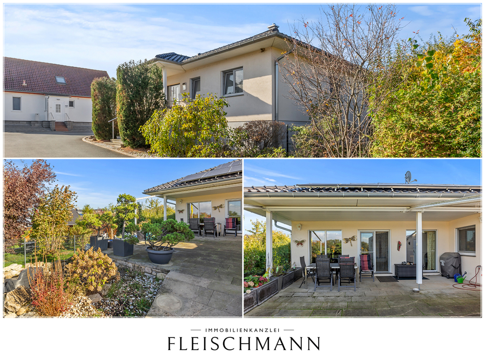 Dieser neuwertige und elegante Bungalow befindet sich in ruhiger und idyllischer Lage von Mechelroda, einer charmanten Gemeinde unweit von Weimar und Bad Berka. Auch bis Erfurt oder Jena sind es nur wenige Autobahnminuten. Das Haus bietet Ihnen ein modernes, komfortables Wohnerlebnis auf einer Ebene. Direkt stufenlos aus der Garage über den Vorratsraum in die Küche. Das macht SpaÃ! Dieses moderne Bungalow- Haus besticht durch seine hochwertige Bauweise und Ausstattung. Barrieren sind hier kein Thema. Eine neue Solaranlage (PV) wurde in 2024 errichtet. Die groÃzügige Doppelgarage hat einen direkten Zugang über den Allzweck- und Vorratsraum zum Haus und bietet damit die Möglichkeit, den Einkauf trockenen FuÃes und auf kurzem Wege in die dafür vorgesehenen Räumlichkeiten zu bringen. Der fast 60m² groÃe Wohn- und Kochbereich ist ein zentraler Platz und könnte Mittelpunkt Ihres Familienlebens werden. Ein moderner Kamin sorgt für Gemütlichkeit, Wärme und ist schön anzuschauen. 3 Schlafzimmer, ein Büro, ein freundliches Badezimmer und ein Gästebad machen aus den 4 Wänden ein wunderbares Zuhause. Wer jetzt schnell ist kann die Ostereier im Garten verstecken. Hier können Sie einziehen und sich sofort wohlfühlen! Der Bungalow ist ideal für Familien und Paare, die Wert auf hochwertige Materialien, groÃzügige Raumaufteilung und nachhaltige Energiekonzepte legen. Die groÃzügige Raumaufteilung und die groÃen Fensterfronten sorgen für ein lichtdurchflutetes, freundliches Wohnambiente und einen unvergleichlichen und sicher auch unverbaubaren Ausblick ins Grüne. Â