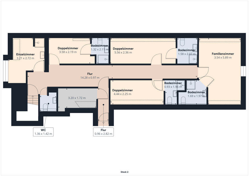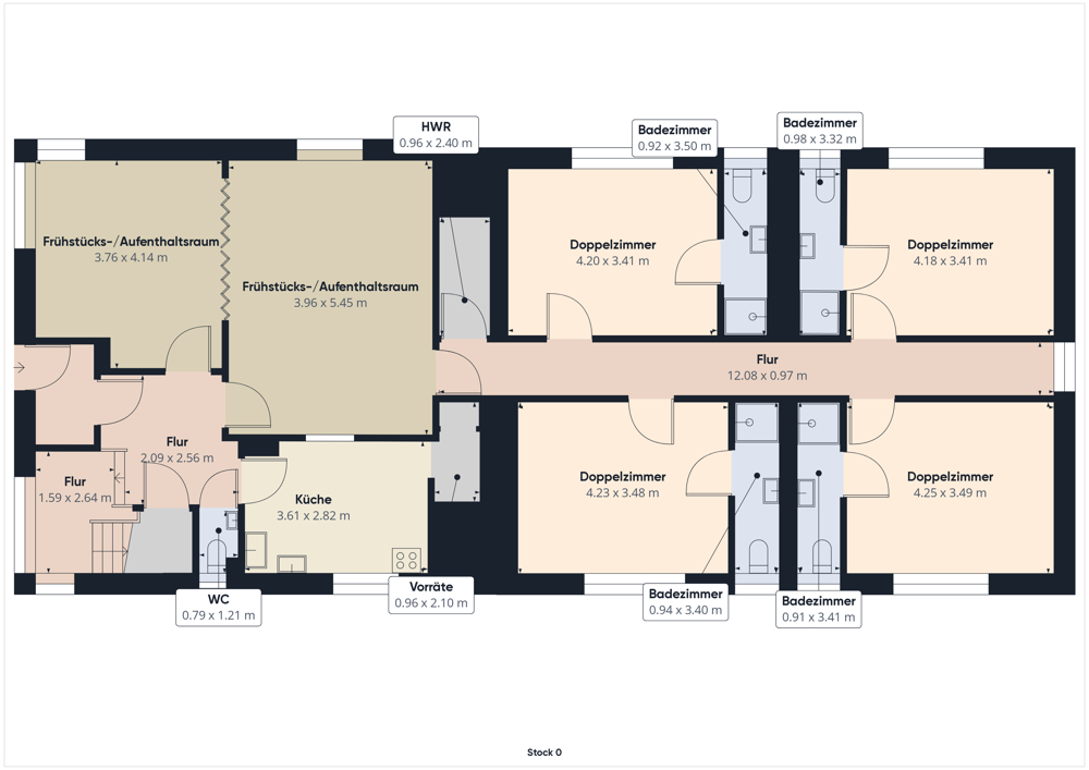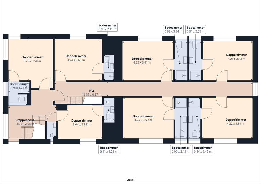 Die Zimmer sind zeitgemäà eingerichtet und renoviert. In 3 der Doppelzimmer stehen die Betten getrennt. TV ist selbstverständlich, in einigen Zimmern gibt es zusätzlich einen kleinen Beistellkühlschrank. Die Bäder verfügen allesamt über eine Dusche. Zusätzlich ist das Haus vollständig unterkellert. Dort befindet sich auch das Büro, Waschkeller, Kühlhaus, Vorrats- und Lagerräume. Der Keller hat 2 separate Ausgänge.