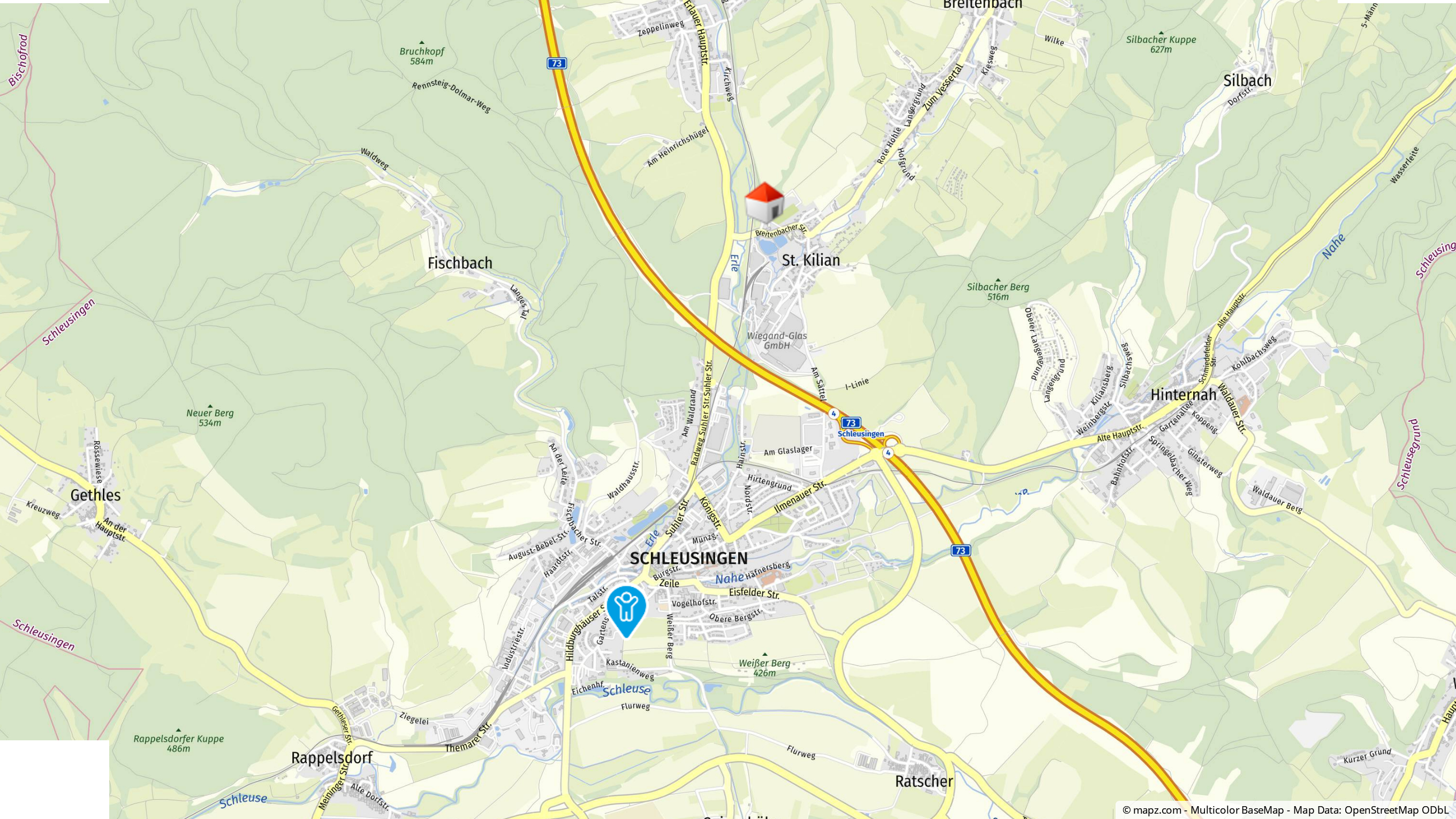 Die Stadt Schleusingen liegt am südlichen Abhang des Thüringer Waldes, umgeben von den Wintersportgebieten Oberhof und Schmiedefeld.In unmittelbarer Nähe befinden sich eine Grundschule, Kinderspielplätze und Stadtbushaltestellen. In der nahen Umgebung findet man alle Einrichtungen des täglichen Bedarfs, ärztliche Versorgung, das Klinikum, alle Schularten, Sport- und Freizeitmöglichkeiten. Schleusingen bietet eine gute Infrastruktur und ist durch die Autobahn A73 an das FernstraÃennetz optimal angebunden. Zur Stadt Suhl sind es 14 km, nach Coburg 41 km ( über die Autobahn A73), zur Landeshauptstadt Erfurt ca. 80 km (A71 / A73). Anfahrt von Norden Fahren Sie von Erfurt über die A71 / A73 bis zur Abfahrt Schleusingen. Anfahrt von Süden Ãber die Autobahn A73 kommen Sie aus Richtung Nürnberg über Coburg.